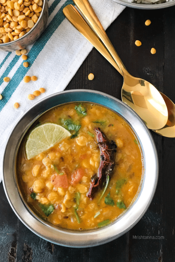 It's made with chana dal (yellow split lentils) and toor dal.